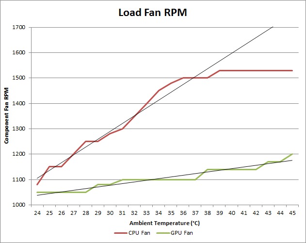 Unlike our temperature readings, the slope of the change in CPU fan RPM is not nearly as straight. As the ambient temperature rises, the slope of the CPU fan RPM line becomes increasingly steep. The GPU fan on the other hand is fairly consistent except that it does not begin increasing until the ambient temperature hits 33° C.