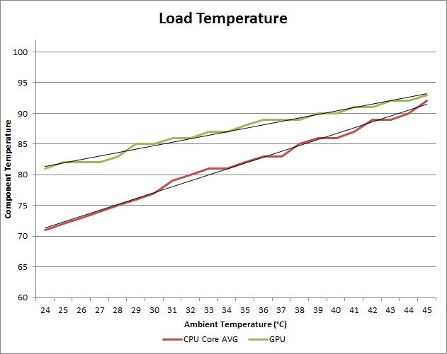 Just like at idle, the CPU and GPU temperature slopes are very linear. Once again, it appears that the CPU temperature increases by about 1° C for every 1° C rise in ambient temperature, while the GPU temperature looks to be closer to .5° C for every 1° C rise in ambient temperature. By applying a trendline with Excel, we found that the slope for the CPU is actually 0.9548x, while the slope for the GPU is 0.5613x. In other words, on average a 1° C rise in ambient temperature results in roughly a .95° C increase in CPU temperature and a .56° C increase in GPU temperature. This is less than our idle results, and is likely due to the dynamic fan throttling attempting to keep the CPU and GPU at a lower temperature.