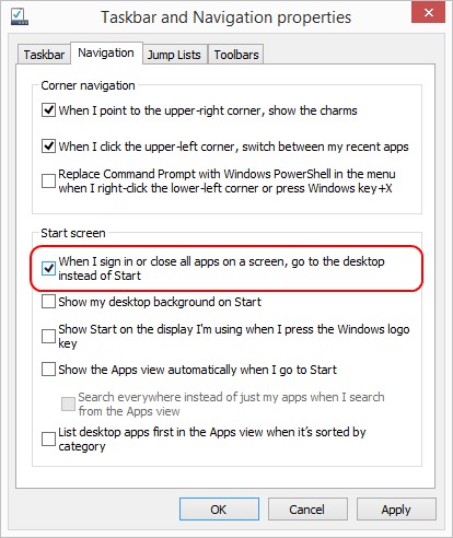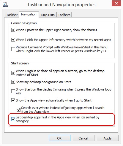 One of the easiest and most noticeable things you can do in Windows 8.1 to make it behave like Windows 7 is to have the system boot directly to the Desktop rather than the Start page. To do this, follow the two steps shown below: