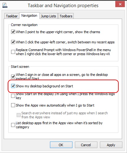 The first bit of customization we recommend doing is to match the Start screen background to the Desktop background. This doesn't cause any real functionality improvement, but it makes the Start screen feel more like a quick popup rather than switching to a different application or screen.