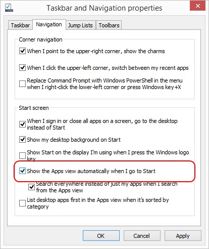 The two Start screen checkboxes that we did not discuss are the "Show Start on the display I'm using when I press the Windows logo key" and "Search everywhere instead of just my apps when I search from the Apps view". The first option to show start in the active display simply makes the start page open on whichever screen your mouse cursor is currently on rather than your primary display. Some people will like this feature, others may not. The second option is to search everywhere rather than just apps when you start a text search (start typing) when on the start page. This means that you can just start typing anything (an application name, document name, etc.) and it should find what you are looking for. This is checked by default, but some people who only use the search feature to launch applications may want to turn it off to speed up the search times.