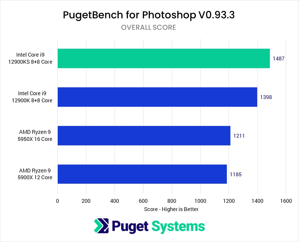 Summary: Intel already holds a strong lead over AMD in terms of Photoshop performance, and the new Core i9 12900KS only furthers their lead. Compared to the i9 12900K, the new i9 12900KS is 6% faster in Photoshop, which puts it a solid 23% faster than any of the AMD Ryzen CPUs.