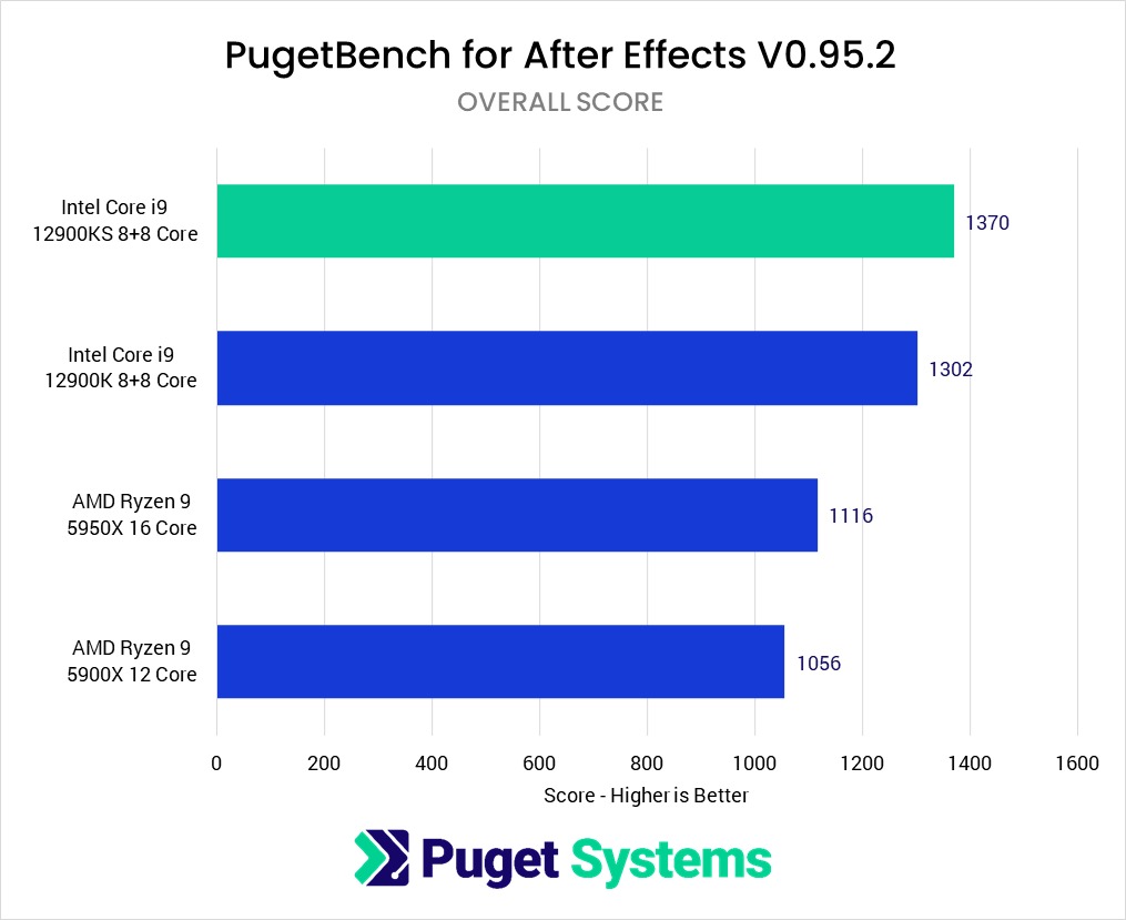 There are some instances where the AMD Ryzen 5950X manages to edge out over the 12900K and 12900KS, but that is primarily only in extremely heavy compositions. If your work includes these types of projects, however, you would likely want to jump up to either an AMD Threadripper (Pro) or Intel Xeon W platform. Having enough RAM is critical for applications like After Effects, and since the consumer Intel Core and AMD Ryzen platforms only support up to 128GB of RAM, they often are not the right choice for that level of project.