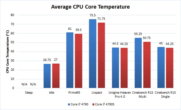 Higher wattage should directly correlate to higher temperatures so it is no surprise that this graph is very similar to the power draw graph. The Core i7 4790S runs at approximately the same temperature as the Core i7 4790 at idle, during Unigine Heaven, and during the single threaded portion of Cinebench R15. Really, the only significant difference in temperature occurred during Linpack and Cinebench R15 (multi threaded mode) where the 4790S ran 4.5 ºC and 3.75 ºC (or 5% and 8%) cooler respectively.