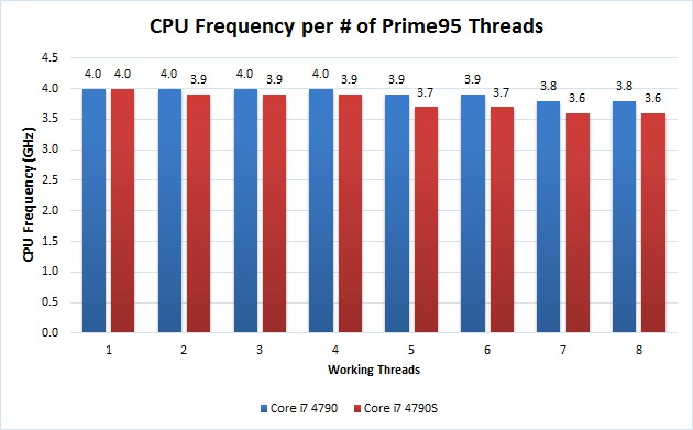 As you can see in the above chart, it is clear that as more CPU threads are being used, the 4790S runs at an increasingly lower frequency than the standard 4790. This means that even though the 4790S and 4790 technically have the exact same maximum Turbo Boost frequency, they are very different as more threads are being used. Depending on the number of threads, the 4790S is anywhere from .1 to .2 GHz slower than the 4790. This isn't much – only about 2.5 to 5.3% slower – but it lines up almost exactly with what we say in our real world benchmarks.