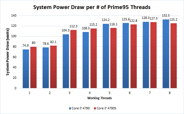 Power Draw: Our testing between a Core i7 4790S and a Core i7 4790 indicates that S-series processors draw less power when more than half the threads on the CPU are being used. On the other hand, our testing also showed that the 4790S actually draw slightly more power when less than half threads are being used.