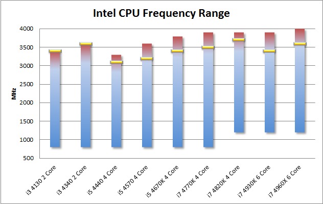 For Intel, the Core i3 CPUs are different than the other models as they do not support Turbo Boost. So for those CPUs, the base frequency is actually the fastest they can run without manual overclocking. One interesting thing we found is that the lower end CPUs (the i5 4440 and i7 4820K) for each socket actually have a much smaller Turbo Boost than the higher end models.