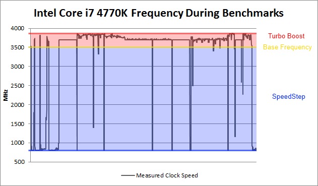 Moving up to the Intel Core i7 4770K, we have some very interesting results. While the CPU down-clocks as expected, the CPU does not run at either the base or maximum Turbo frequency very much. Instead, it spent most of its time at about 3.7GHz, which is right in the middle between the base and maximum Turbo frequencies.