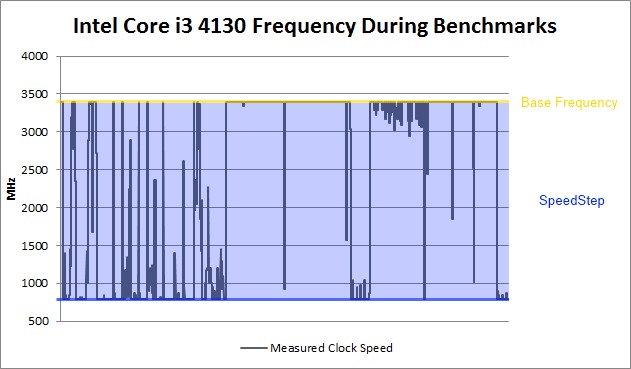 As expected, for CPUs that don't support Turbo Boost or Turbo Core (like the Intel Core i3 CPUs) we found that the base frequency is exactly the speed that the CPU runs at when under a heavy load. But for the CPUs that do support either Intel or AMD's brand Turbo technology, the speed at which the CPU operates appears to vary greatly depending on the individual CPU model.