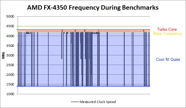 The FX-4350 has a very small Turbo frequency increase, but even then it spent very little time at that Turbo frequency. Most it the time it was either at the base frequency, the minimum frequency from Cool 'N' Quiet, or at some point in between.