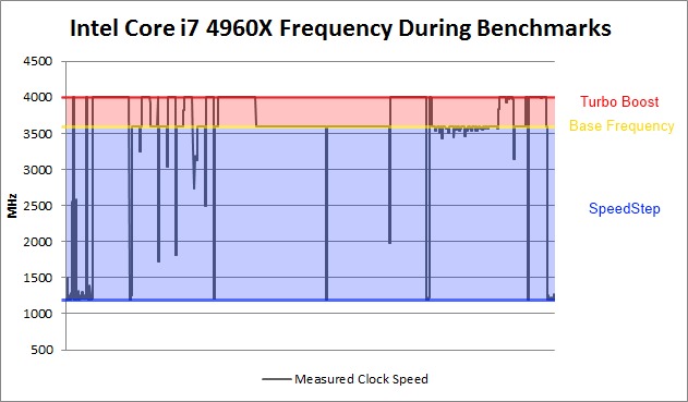 The i7 4960X is remarkably similar to the i7 4820K even though the frequency increase from Turbo Boost is much larger. Once again, when the CPU was under load it spent most of its time either at the base or Turbo frequency, rarely operating at any point between the two.