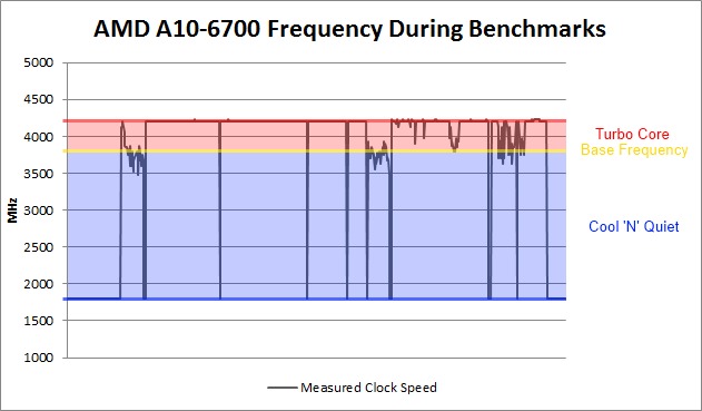 Moving to AMD, the A10-6700 results are more in line with what we originally expected to see from a modern CPU. It spends a decent amount of time hovering around the base frequency, but spends most of it's time at the maximum Turbo frequency or very close to it.