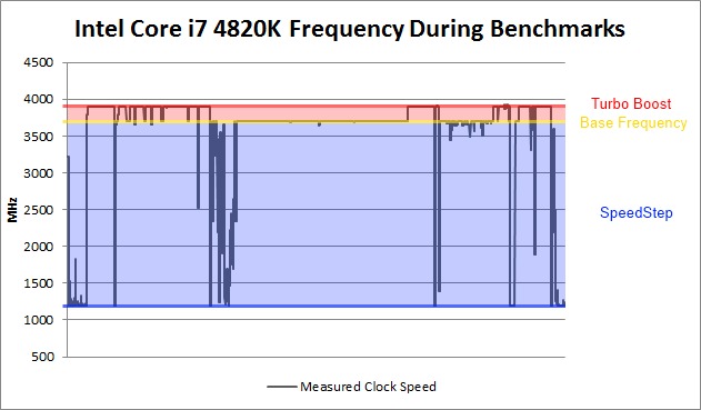 Unlike the i7 4770K, the i7 4820K actually did spent a decent amount of time at it's base frequency. Also unlike the 4770K, this CPU tended to jump between the base and Turbo frequencies without spending much time in between.