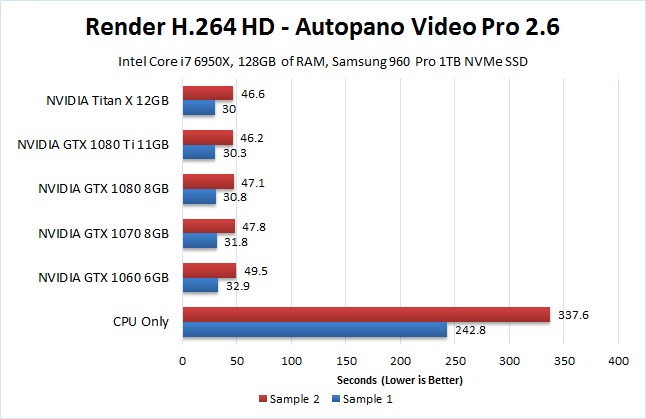 Overall, there are massive performance gains to be had be using a GPU in Autopano Video Pro but using a high-end, expensive video card is a bit harder to justify. There are certainly advantages to using a more expensive GPU, but it gets less and less impressive as you get into the more expensive cards. Unless you are looking to get the absolute best performance possible out of Autopano Video Pro, we would recommend sticking with a GTX 1060 or GTX 1070 and focusing your budget on getting the best CPU you can.