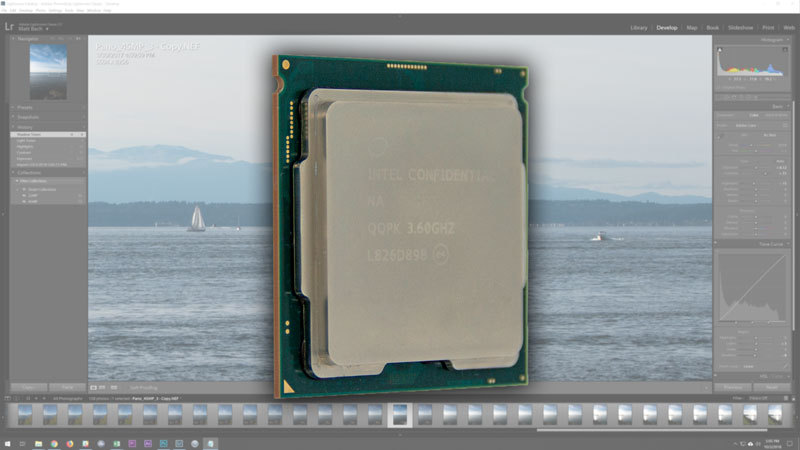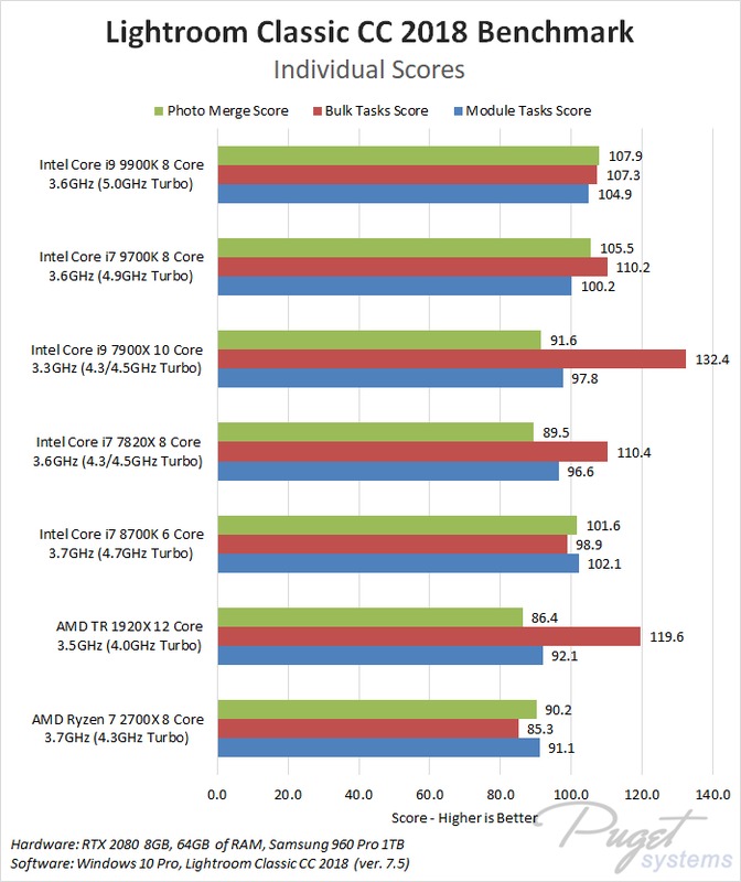 In the module tasks (scrolling through images and switching between the Library and Develop modules), there was surprisingly little difference between all the Intel CPUs we tested, although the AMD CPUs lagged behind just a bit. The new Core i9 9900K was at the top, but it was only a few percent faster than the i7 8700K which is likely within the margin of error for those tests. However, both the i7 9700K and i9 900K were definitely a bit faster in photo merge tasks, coming in at 4-6% faster than the i7 8700K