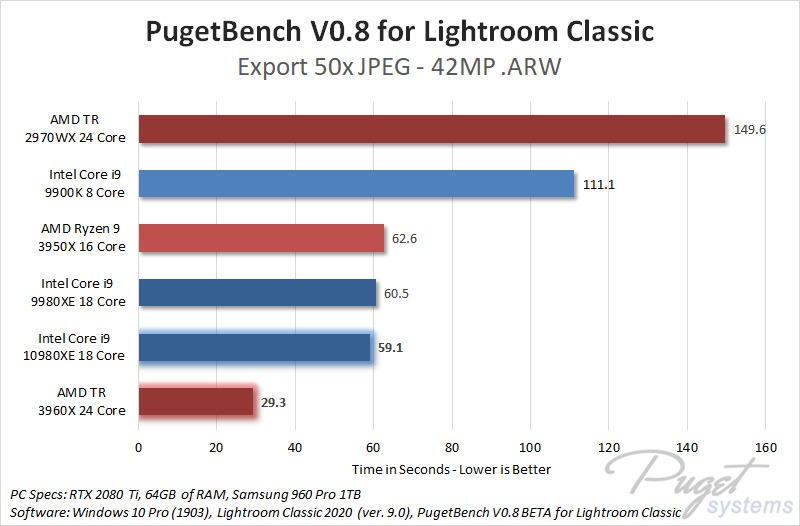 If there is one thing that is abundantly clear, it is that AMD simply dominates when it comes to performance in Lightroom Classic. While the drop in price for Intel's new X-series CPUs is great, the fact that the AMD Ryzen 3rd Gen CPUs are simply faster at an even lower price point pretty much makes them moot for a workstation that is optimized for Lightroom Classic.