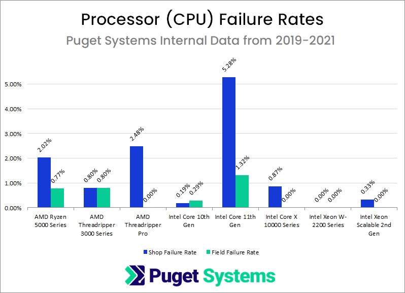 AMD CPUs in general had higher failure rates than Intel, but we did see an oddly high rate of failures with Intel's consumer-oriented 11th Gen processors... which seems odd, especially next to the very low rates shown by the preceeding 10th Gen.