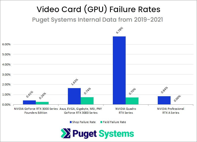 Beyond that, it is also interesting to note that NVIDIA's GeForce RTX 30 Series Founders Edition cards are markedly more reliable than those from third-party manufacturers. Those FE cards also have unique cooling layouts in this generation, making them more ideally suited to use in dual video card combinations. Only the "professional" RTX A Series has a lower field failure rate, but since those cards are also newer they haven't yet had as much opportunity to fail.
