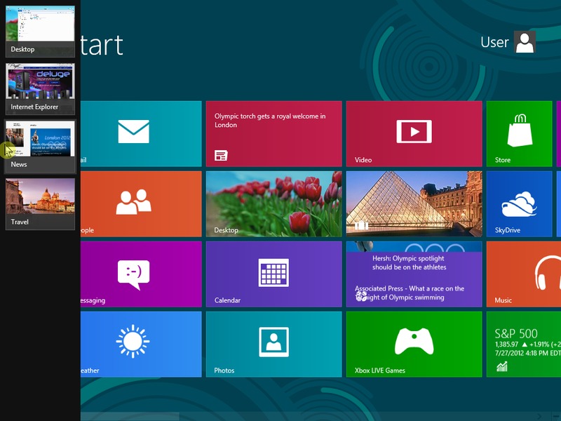 If you have multiple applications running and want to switch to a different app, you can use either the keyboard or the mouse to bring up one of the other already running programs. With the mouse, first move the cursor to the top-left corner of the screen. A single app will show up which is the most recent app that was viewed. If you want to view all of the currently running apps, move the mouse down to display all of the other running apps. With a keyboard, use the hotkey combination "WinKey+Tab" to show the list of all the running apps. You can either click on an app with the mouse, or if you hold down the Windows Key and keep tapping the Tab key, you will cycle through the apps. Releasing the Windows Key will bring up whichever app is currently being highlighted. The familiar "Alt-Tab" still works to switch between applications like previous versions of Windows, but it will switch between all programs running on the computer, including those on the desktop, and not just Metro applications.