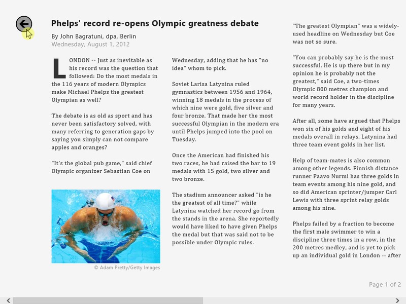 Scrolling on some apps like Internet Explorer will use the familiar vertical scrolling found on most webpages, but many other Metro apps will utilize horizontal scrolling just like the Metro Start interface. In these apps, scrolling is just a bit different than the Metro Start interface as you can only either use the mouse wheel or click and drag the scroll bar at the bottom of the screen with the mouse. Moving the mouse to the edge of the screen will not scroll the page in most Metro apps. Alternatively, you can use the keyboard arrow keys to scroll.