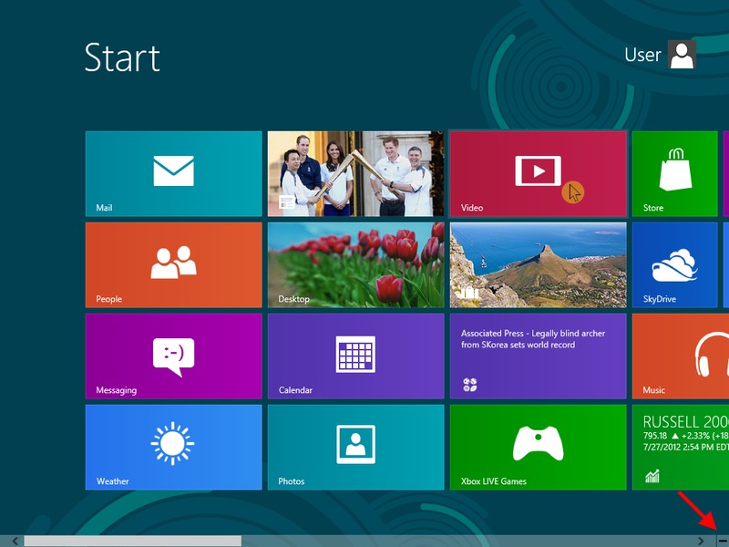 For those familiar with the prior Windows interface, the biggest change is the move from vertical scrolling to horizontal scrolling. While some apps like Internet Explorer still scroll vertically, the majority of Metro apps are intended to scroll left and right. To actually scroll across the Metro screen, you can use the mouse wheel, move the mouse cursor to the far left/right side of the screen, or click and drag the scroll bar at the bottom of the screen. Alternatively, you can use the keyboard arrow keys to navigate to different applications on the Metro interface.