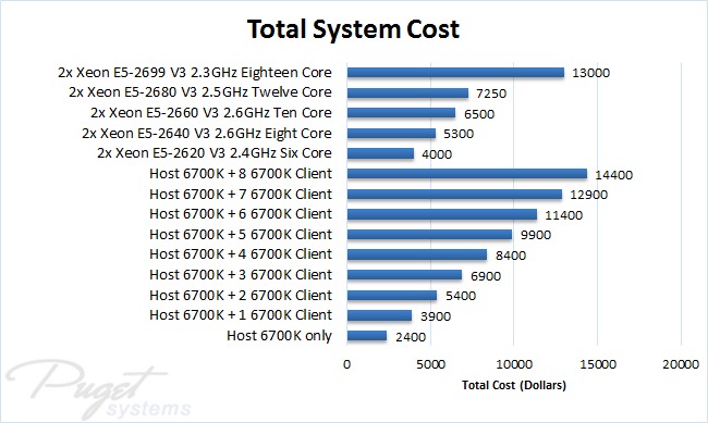 If you look at the chart to the right, we estimated the total cost you would need to pay for a range of Dual Xeon systems alongside a cluster with up to eight clients using Intel Core i7 6700K CPUs. These costs were based off our Recommended Systems only with the GPU removed for the client machines.