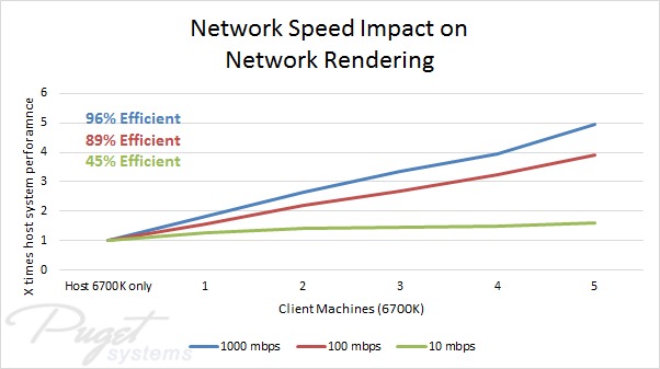What we found is that using a 1000 mbps (gigabit) network results in an overall efficiency of about 96%. This basically means that each client you use has about a 4% overhead so there is diminishing returns as you add more and more clients. 96% is actually very impressive, but the efficiency drops to about 89% with a 100mbps network and all the way down to just 45% with a 10mbps network. In other words, you really want to have as fast of a network as possible to get the full benefit from network rendering. This definitely means you should avoid using wireless if at all possible.