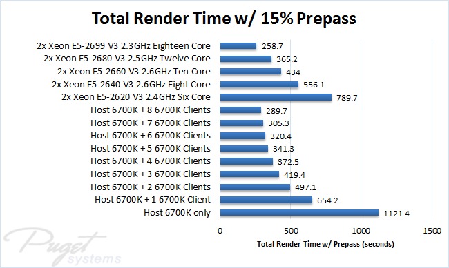 If your prepass time tends to be fairly short (about 15% of the total render time), a cluster may still work well for you. It would take more than the eight machines we calculated the performance of to match a Dual Xeon E5-2699 V3, but only five clients (plus the host) to beat the much more reasonably priced Dual Xeon E5-2680 V3. However, once you get up to the 30-40% prepass range, you are never going to be able to match even a Dual Xeon E5-2680 V3 no matter how many clients you have. You can, however, still beat the performance of a Dual Xeon E5-2640 V3 or lower with around two to three clients.