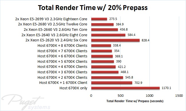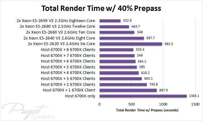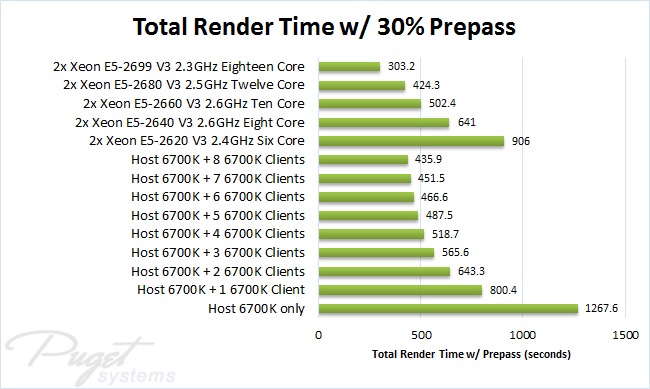 The only time you can match the performance of a Dual Xeon E5-2680 V3 system is if the prepass is only 20% or less of the total render time. Even then, it would take about 5-6 client machines which is actually $2,650-$4150 more than the Dual Xeon system. Even going down to the Xeon E5-2660 V3 CPUs (which would run about $6,500 for a full system), you would need to have between three and five clients to match the performance depending on the prepass percentage. This would make a cluster anywhere from $400 to $3,400 more expensive.