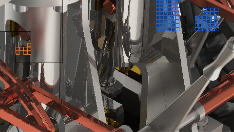 If a dedicated rendering machine doesn't make sense, another option is to take advantage of the PhotoView 360 Network Rendering Client to split up the render across multiple machines. When you install this client onto other machines on your local network, it essentially creates a cluster which allows Solidworks to offload portions of a render to these machines. For example, in the screenshot to the right the orange buckets are being rendered on the local host machine while all the blue buckets are being sent over the network to be processed on other machines.
