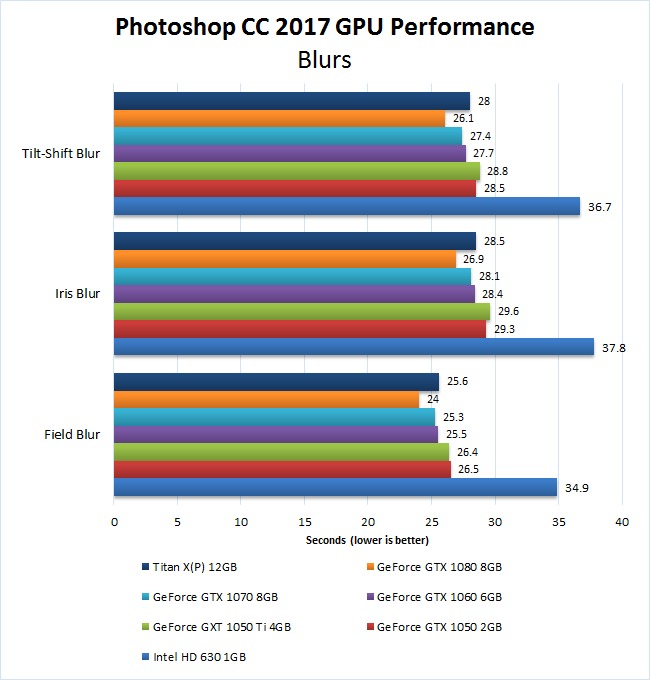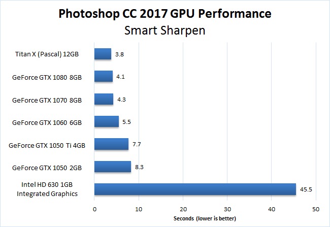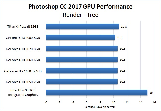 If you take a even a quick look at the charts above, it is obvious that the results are very polarized. Some actions like the various blurs and "Smart Sharpen" show excellent performance gains with even a low end GPU compared to the integrated graphics, and pretty decent gains with the higher end GPUs (up to the GTX 1080 at least). Others like "Render – Tree" and "Lighting Effect" show a good performance gain from using a discrete GPU, but not much of a reason to get a higher end card.
