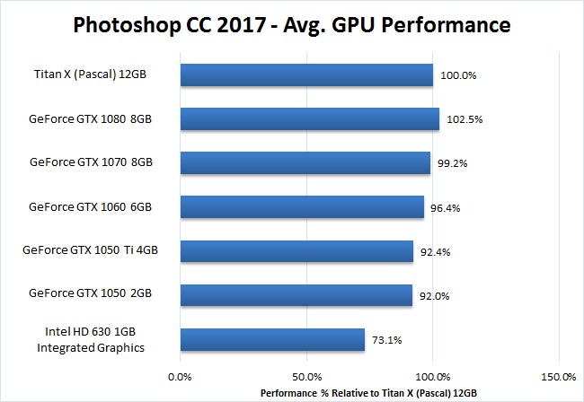Since the performance benefit from the different GPU models changes drastically depending on the specific action, we considered not having an overall average chart in our conclusion. However, since most Photoshop users perform a wide variety of actions throughout the course of their work we decided that it is still a valid way to present our conclusions. Just keep in mind that if there is a specific action that you hate waiting on and want to optimize your system for, this average is not going to be as accurate at looking at the results of just that singular action.