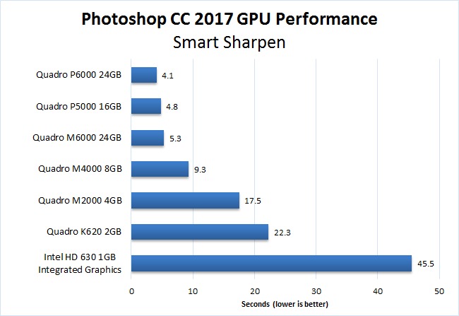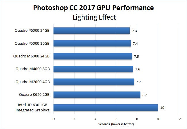If you take a even a quick look at the charts above, it is obvious that the results are very polarized. Some actions like the various blurs and "Smart Sharpen" show decent performance gains the the different Quadro models. However, others like "Render – Tree" and "Lighting Effect" show a good performance gain from using a discrete GPU, but not much of a reason to get a higher end card.