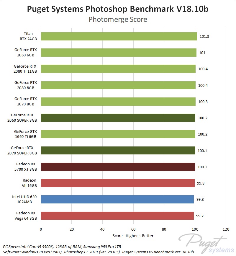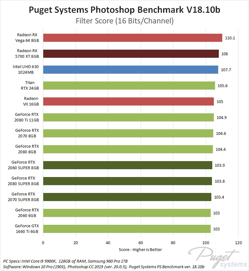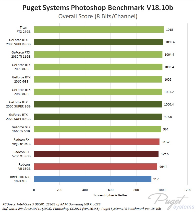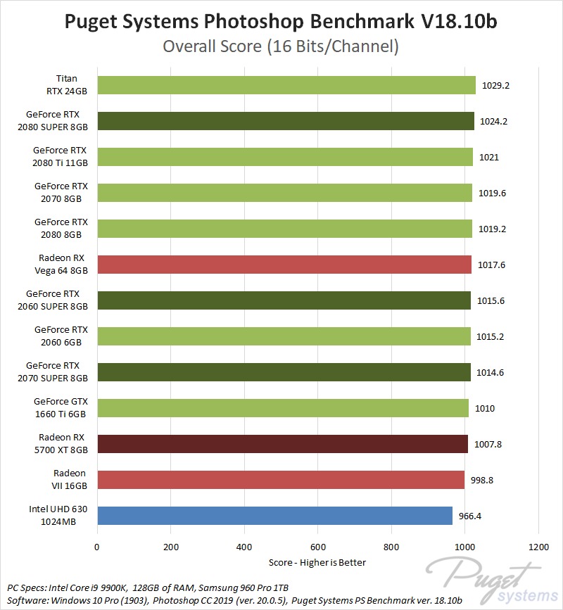 Since we are specifically looking at video cards in this post, we are going to mostly examine the "GPU Score (16 Bits/Channel)" result. If you scroll to the next chart to look at the "Overall Score", you will notice that there isn't much of a difference between each GPU when looking at Photoshop performance from an overall perspective. In fact, in that case even the NVIDIA Titan RTX is only ~5% faster than the integrated graphics on the Core i9 9900K. However, if we look at just the tasks that actually benefit from using a discrete GPU, we at least get enough of a separation between the different models to pull out some useful information.
