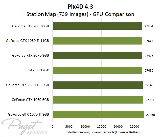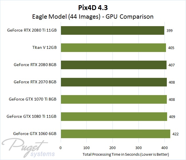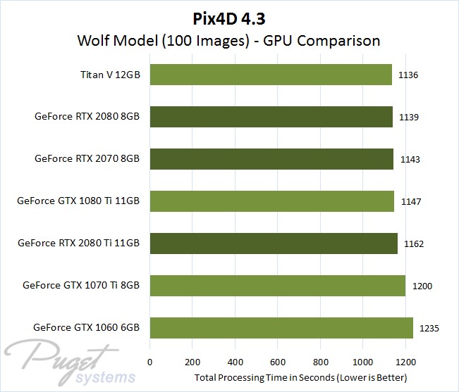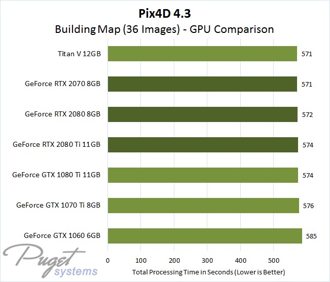 Pix4D's use of the video card is small enough that even a mid-range card like the GeForce GTX 1060 isn't a bad choice, but within the current line of GeForce RTX cards, our recommendation would be to go with the RTX 2070. It is measurably faster than the older 1060 and 1070 Ti, and cheaper than the older 1080 Ti and current 2080 models – which were never more than a few seconds faster.