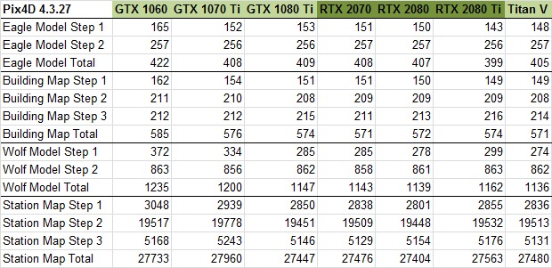 The CPU platform we tested these video cards on was Intel's X299, with one of the top-end processors it supports. This isn't the absolutely fastest CPU for Pix4D, as we discovered during processor testing we were doing concurrently, but it is fast enough to let us see the difference in performance provided by various GPUs. Speaking of which, we included the full line of NVIDIA's new GeForce RTX cards in this test, along with several of the previous generation GTX cards and the top-end Titan V.