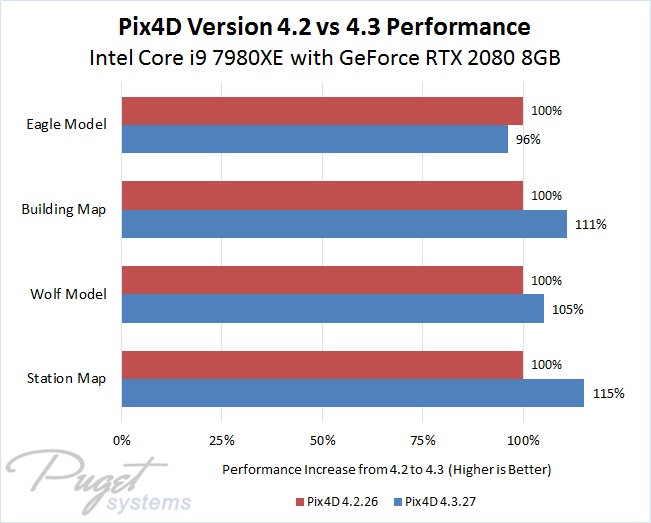 Recently, a new version of Pix4D was released – right when we were in the middle of testing new CPUs and video cards. If there was no change in performance it would have made things easy, as we could have simply continued to test the older version and published that data… but it turns out that Pix4D 4.3 has substantial improvements in speed, on average, compared to 4.2!