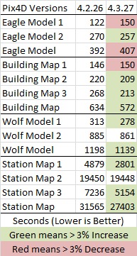 Without further ado, here are the results for total processing time on each of these image sets, showing Pix4D 4.3's speed-up vs 4.2: