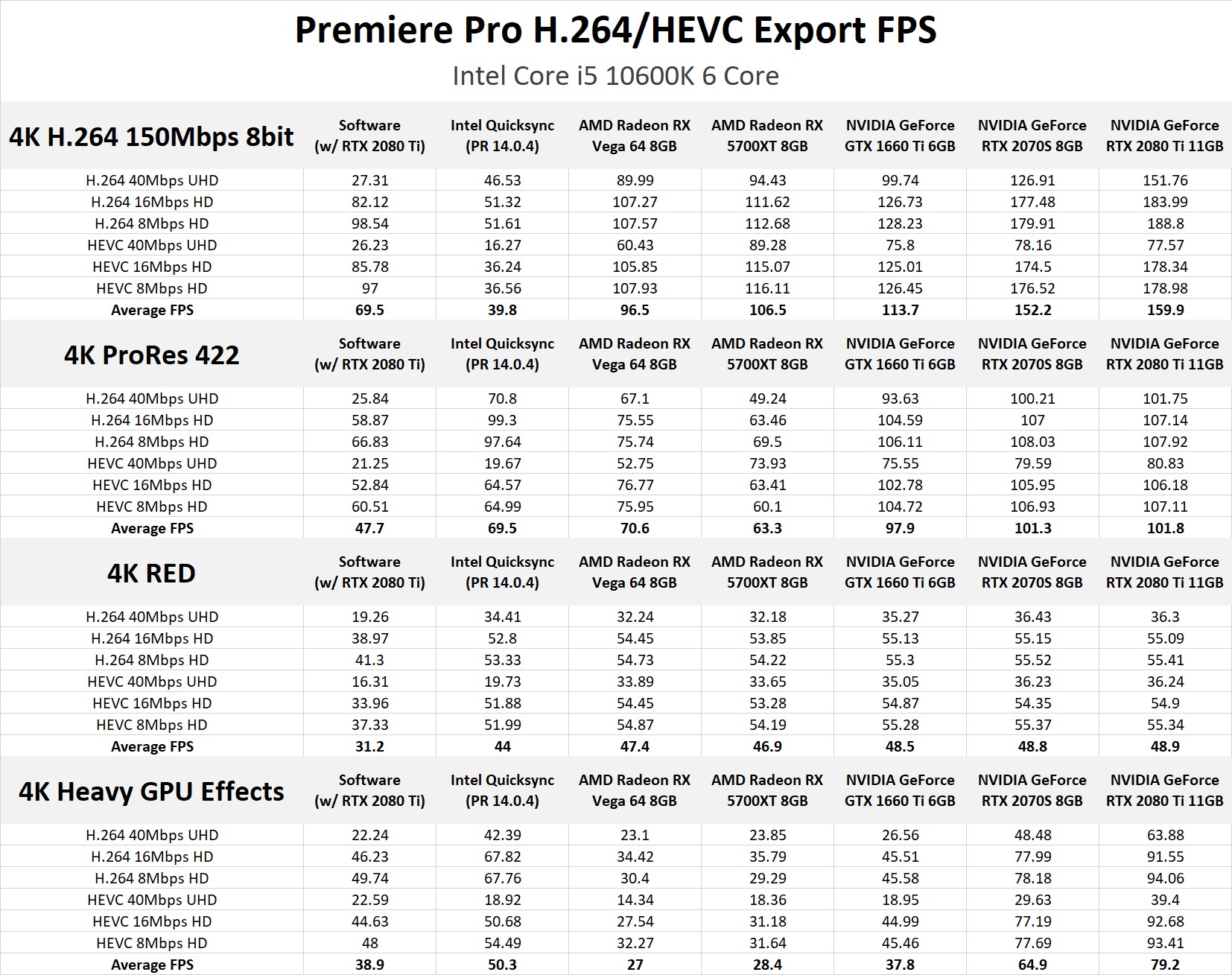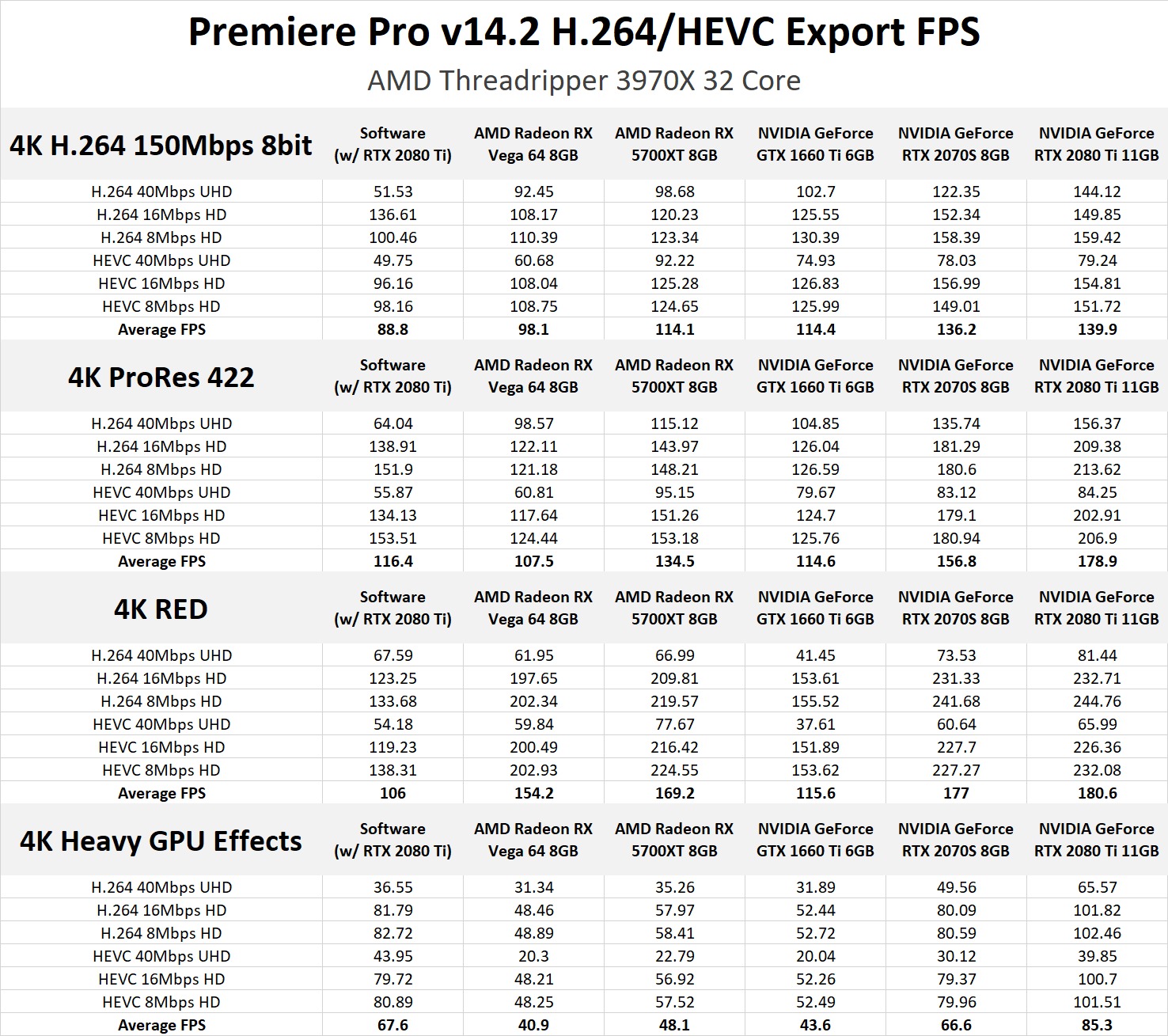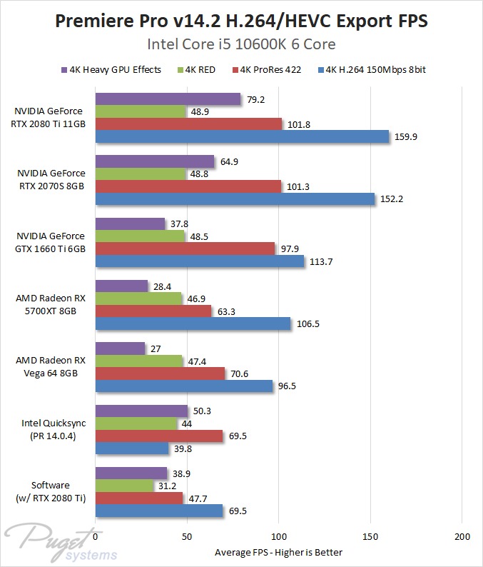While a 1.3-2x increase in export performance is nothing to scoff at, it really isn't a fair way to measure hardware encoding since it is combining all of the results - including those from situations that are far from ideal for hardware encoding. This includes the tests using a powerful AMD Threadripper 3970X CPU (which has so much power that even software encoding is pretty speedy) as well as our 4K RED and "4K Heavy GPU Effects" sequences that are already putting a heavy load on the video card on top of the hardware encoding.