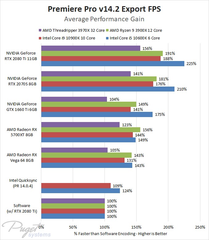 4) In general, the largest performance gains will be seen on systems with relatively underpowered CPUs compared to their GPU. It varies based on your source media and export settings, but where we saw a maximum 5.5x increase in export speed with the Core i5 10600K 6 Core, the AMD Threadripper 3970X 32 Core system only saw at most a 3x increase in performance. The Threadripper system is certainly overall much faster at exporting (with the exception of H.264 source media as noted in the previous point), but the relative performance gains are not quite as significant.