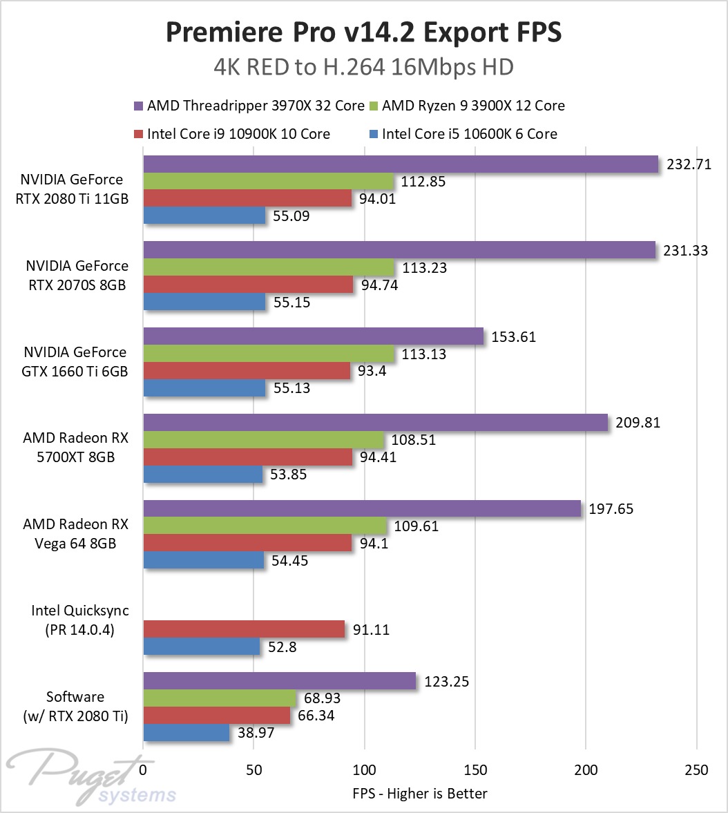 3) Intel platforms are slightly better for encoding H.264 source media to H.264 (and presumably also for H.265 -> H.265) since they have Intel Quicksync which helps accelerate decoding of the source footage. It is significant enough that on our tests with H.264 source media, the Intel Core i5 10600K 6 Core was often as fast or faster than the AMD Threadripper 3970X 32 Core. This means that if you work with a lot of H.264/H.265 media and want to minimize export times, you should stick with an Intel-based system with Quicksync - at least until Adobe adds GPU-based H.264/H.265 decoding.