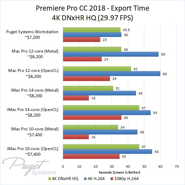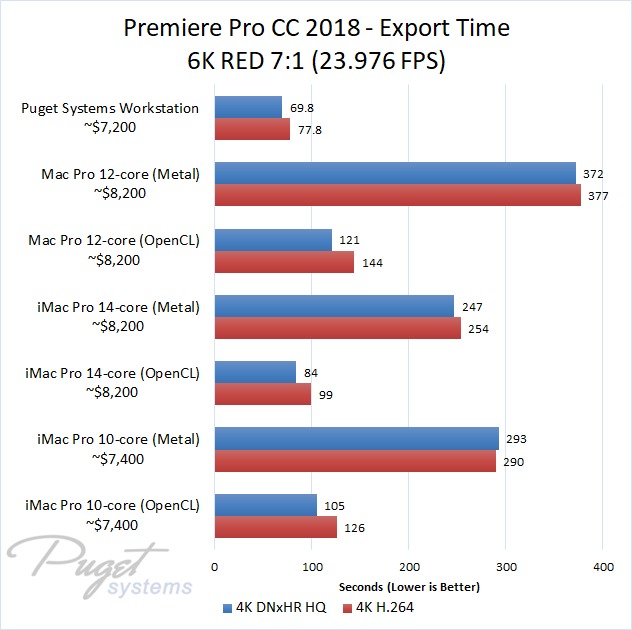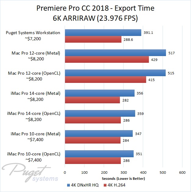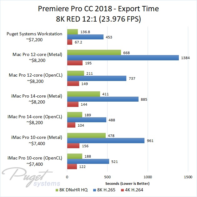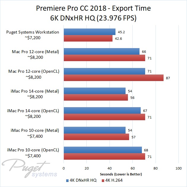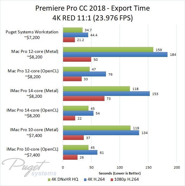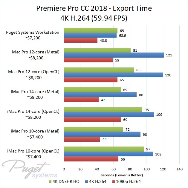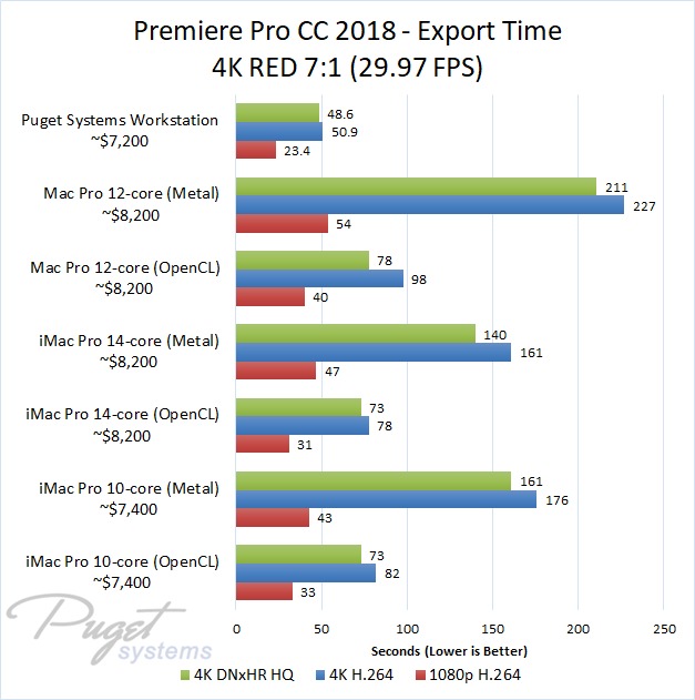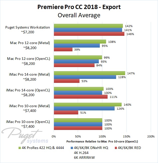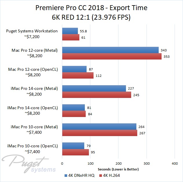 If you do stick to OpenCL, our PC workstation was able to export our test projects roughly 40% faster than the iMac Pro 10-core even though the PC is slightly less expensive. The performance gap closes a small amount if you upgrade to the 14-core iMac, but the PC still has a 30-40% performance lead depending on the type of media you are using. Surprisingly, the Mac Pro manages to keep up with the newer iMac Pro systems with ProRes footage, but fell behind with the other types of media we tested. Due to this, our PC workstation was anywhere from 40% to 60% faster even though it is ~$1,000 less expensive.