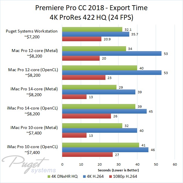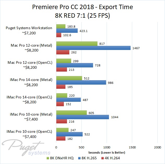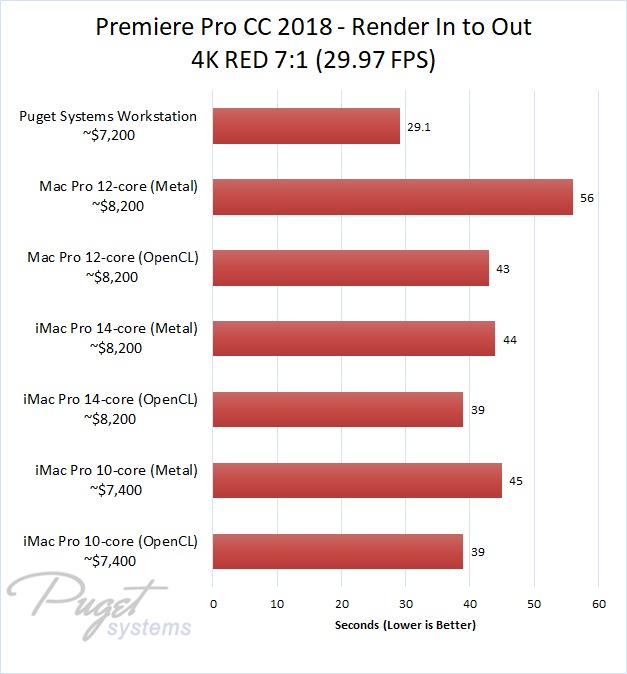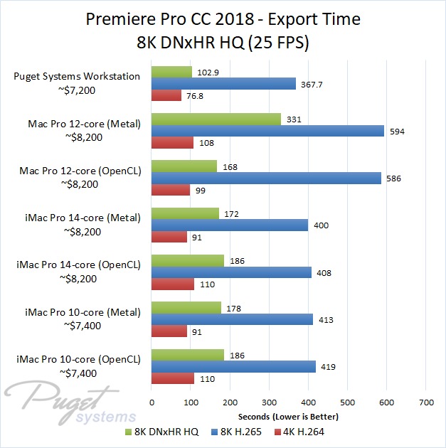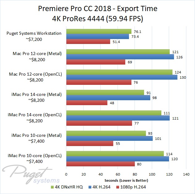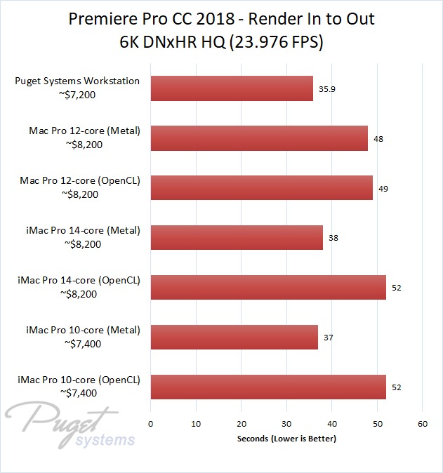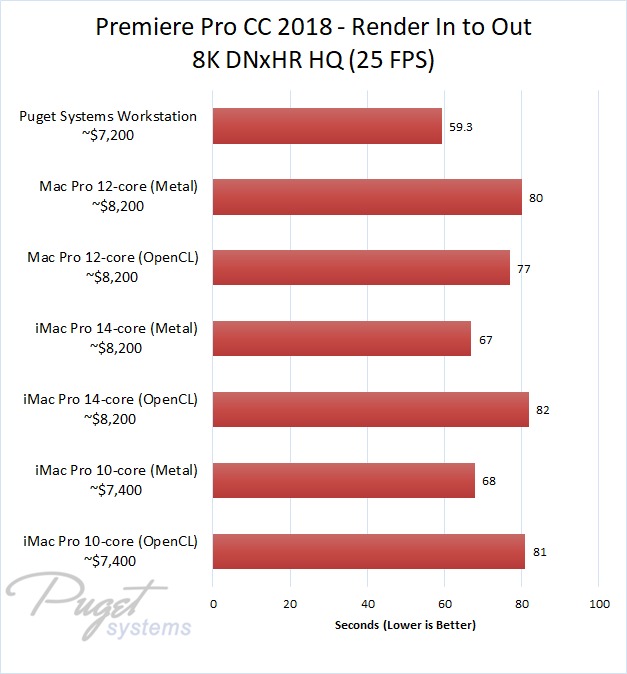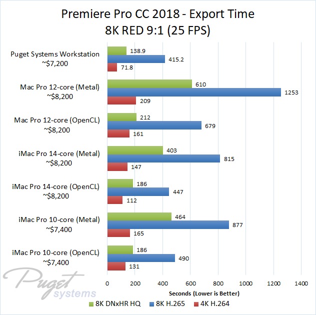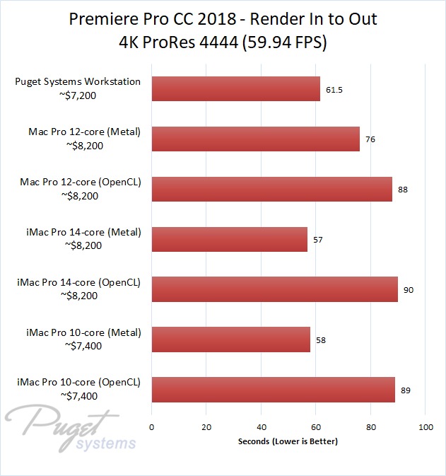 If you do stick to OpenCL, our PC workstation was able to export our test projects roughly 40% faster than the iMac Pro 10-core even though the PC is slightly less expensive. The performance gap closes a small amount if you upgrade to the 14-core iMac, but the PC still has a 30-40% performance lead depending on the type of media you are using. Surprisingly, the Mac Pro manages to keep up with the newer iMac Pro systems with ProRes footage, but fell behind with the other types of media we tested. Due to this, our PC workstation was anywhere from 40% to 60% faster even though it is ~$1,000 less expensive.