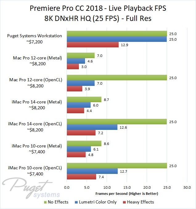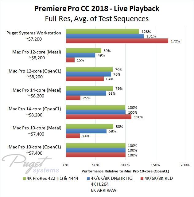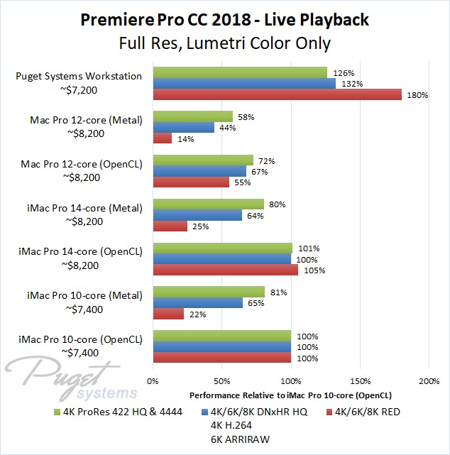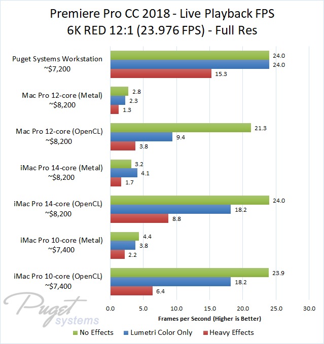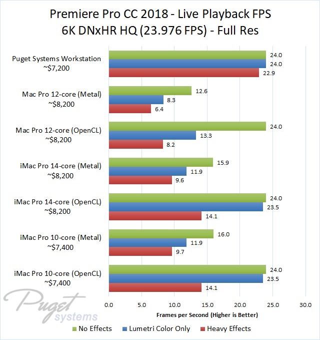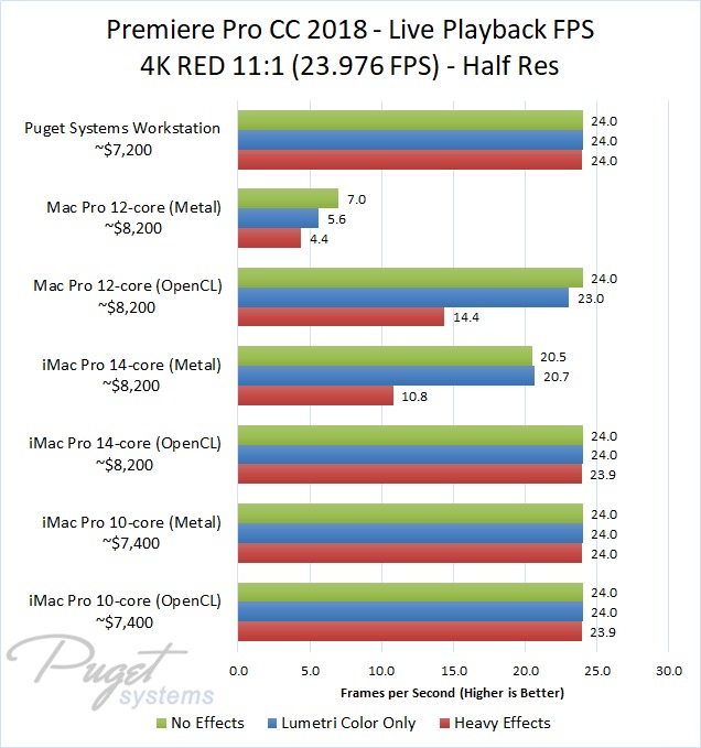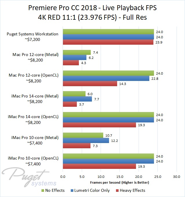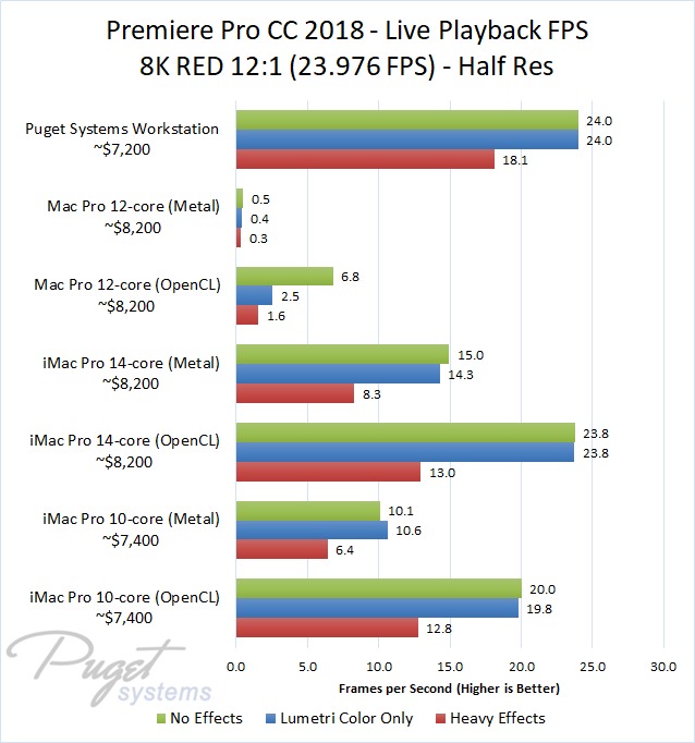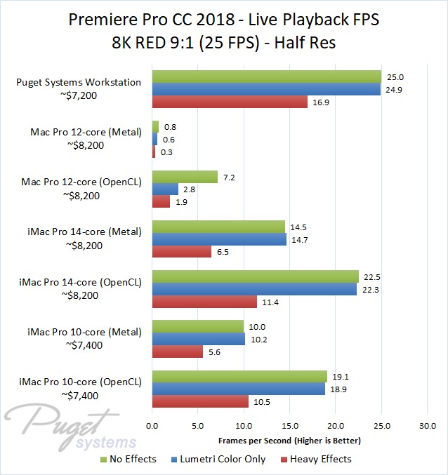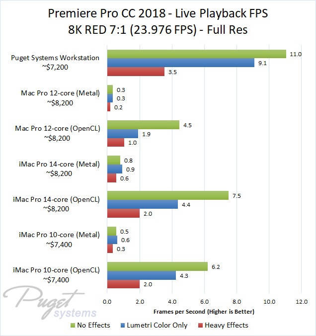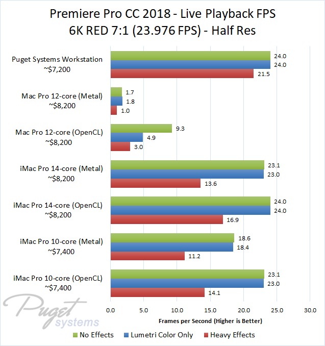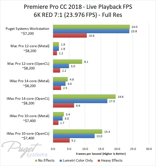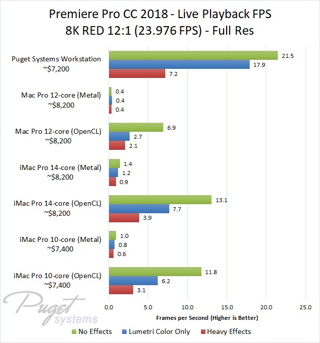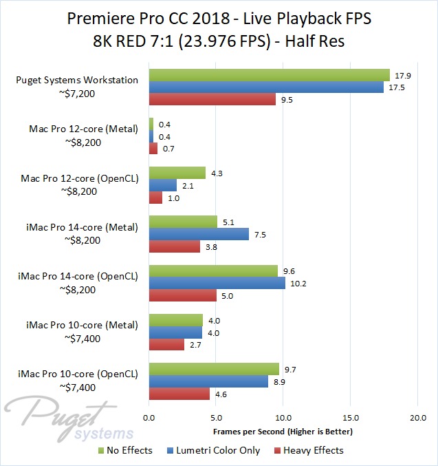 The 14-core iMac Pro did a little better with RED footage – coming in at about 10% faster than the 10-core iMac Pro – but our PC workstation was still 25-60% faster depending on the type of footage. And compared to the old (but still actively sold) Mac Pro, it's not even a competition: you are easily looking at up to a doubling or more of FPS with a less expensive PC workstation.