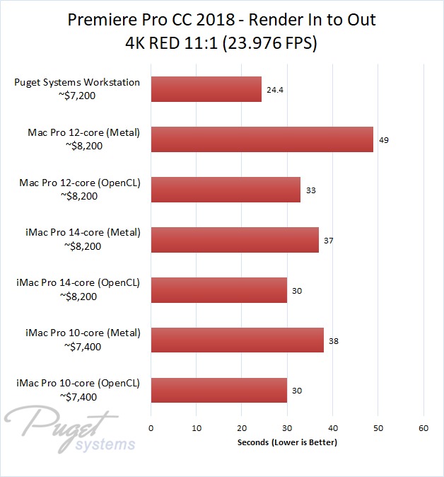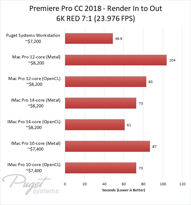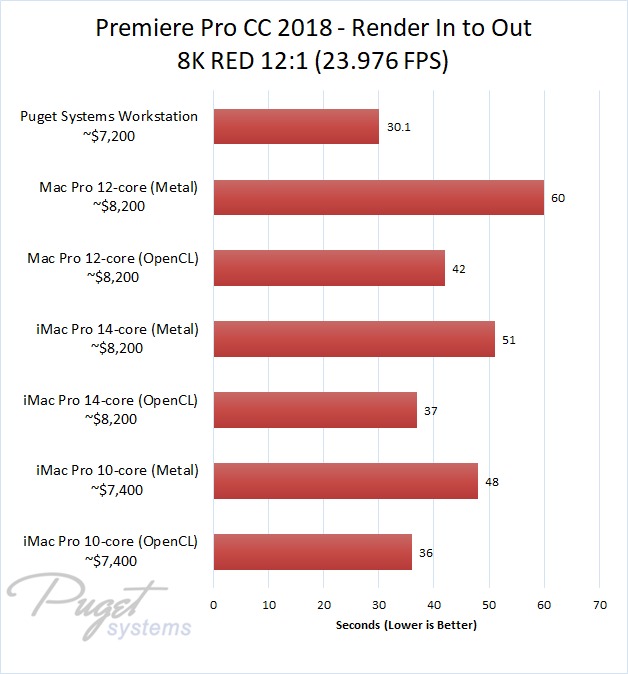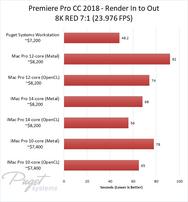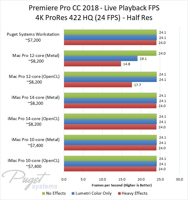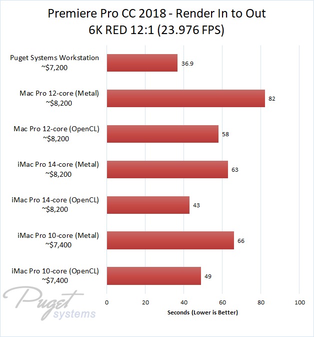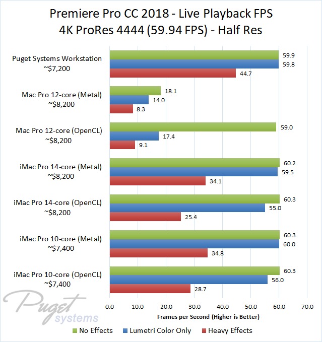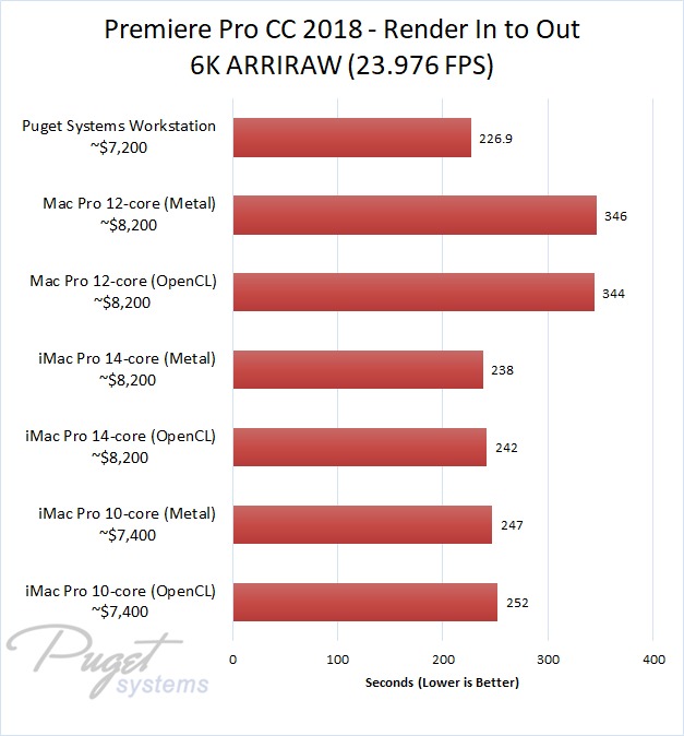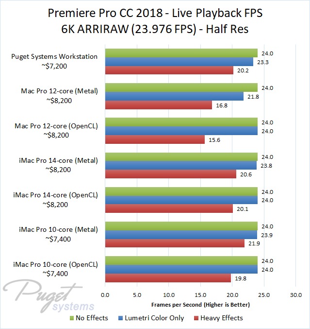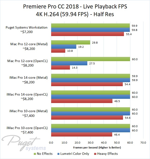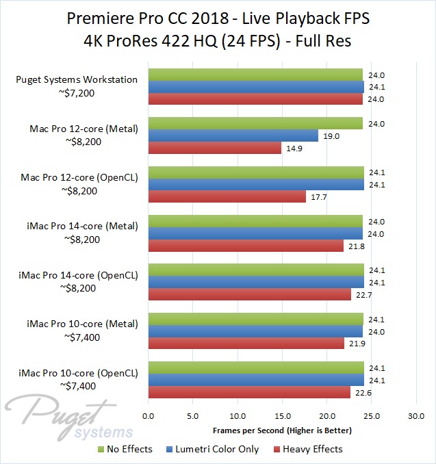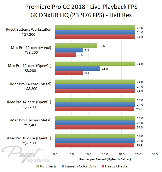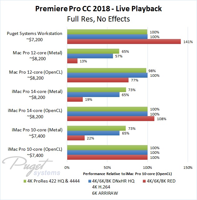 The 14-core iMac Pro did a little better with RED footage – coming in at about 10% faster than the 10-core iMac Pro – but our PC workstation was still 25-60% faster depending on the type of footage. And compared to the old (but still actively sold) Mac Pro, it's not even a competition: you are easily looking at up to a doubling or more of FPS with a less expensive PC workstation.