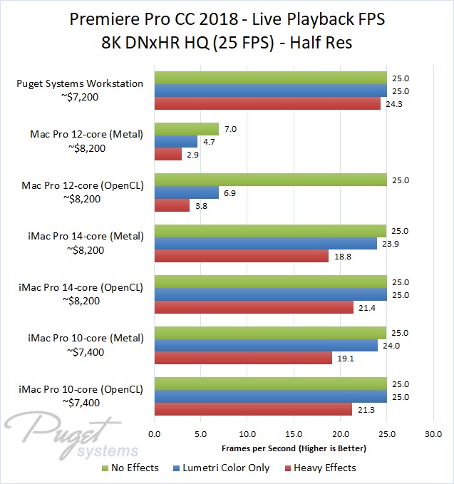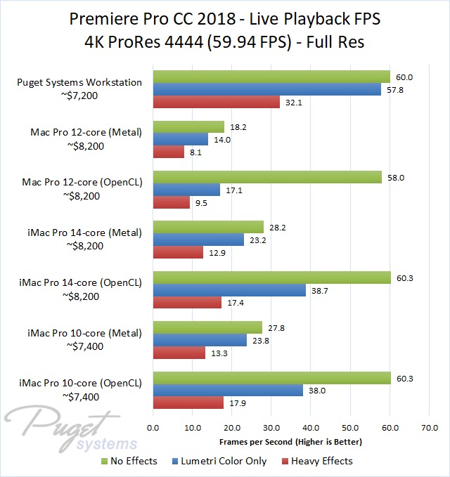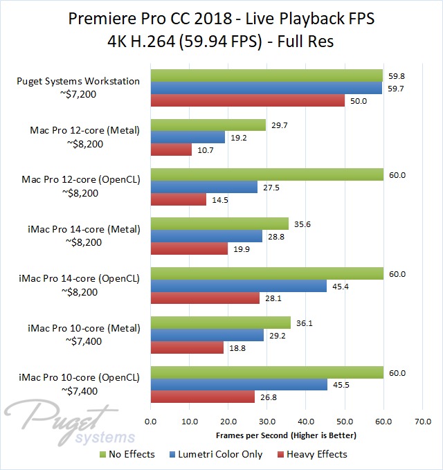 Clearly, you don't want to use Metal if you care at all about live playback performance. Even sticking to OpenCL, however, you are looking at a nice bump in FPS by using a PC. Compared to the slightly more expensive iMac Pro 10-core, our PC workstation gave about 25% higher FPS with ProRes media, 30% higher with DNxHR HQ/H.264/ARRIRAW, and almost 75% higher FPS with RED footage. That isn't quite double, although it was knocking on the door in our "Heavy Effects" test where it was on average 94% faster.