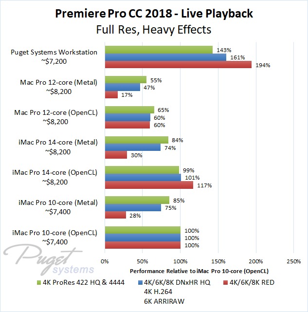 Looking at the results from an average standpoint, compared to the $7,400 iMac Pro 10-core we saw roughly a 35-45% performance gain with a slightly less expensive $7,200 PC workstation. Surprisingly, the $8,200 iMac Pro 14-core wasn't much faster than the 10-core version, only increasing performance by about 5% for an extra $800. If you are currently on a Mac Pro (or for some reason thinking about buying one), the performance difference between Mac and PC is quite a bit larger. Live playback performance was on average twice as good on PC while rendering and exporting was 40-50% better.