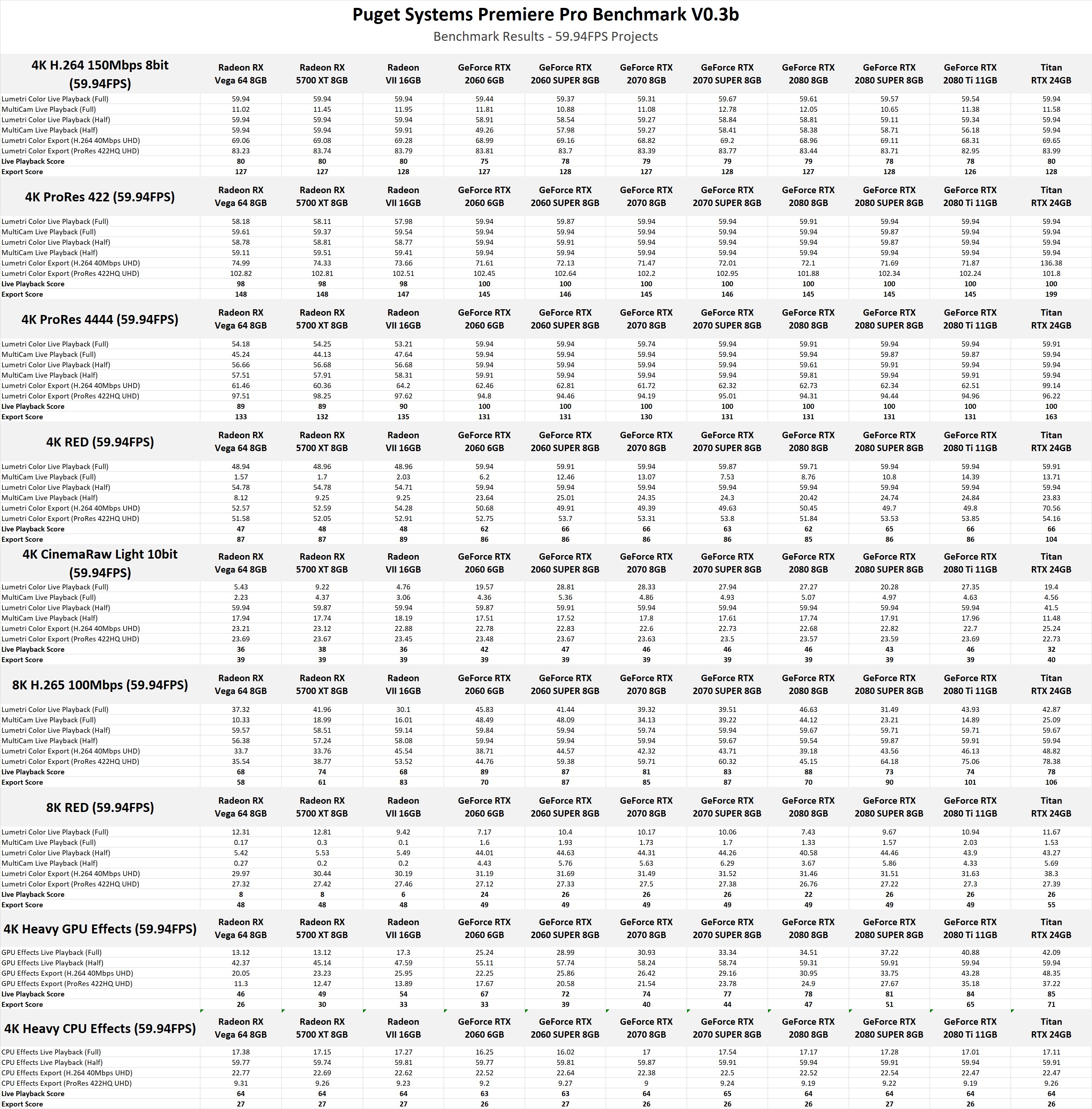 While our benchmark presents various scores based on the performance of each test, we also wanted to provide the individual results. If there is a specific codec that you often work with, examining the raw results for that task is going to be much more applicable than the Overall Score. Feel free to skip to the next section for our analysis of these results if you rather get a wider view of how each GPU performs in Premiere Pro.