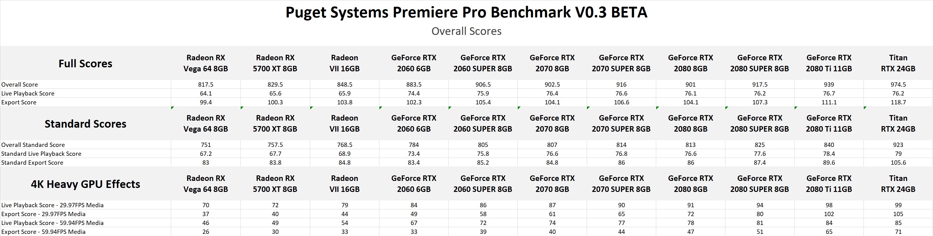 While all the tests used to generate the "Overall Score" utilize the GPU to some degree, it is intended to show the overall system performance for relatively common editing sequences. Since in most cases Premiere Pro is still more reliant on the performance of your CPU than your GPU, it means that there is really only about a 20% performance gap between the fastest and slowest cards we tested.
