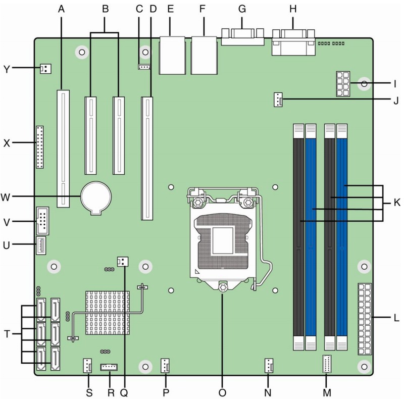 Overall, we have few complaints over the layout of the components on the motherboard. Since this board is primarily designed for use in a rackmount chassis, the 24-pin ATX power connector (letter "L" in the diagram) is along the top of the motherboard rather than the right side. This is due to the fact that rackmounts are heavily dependent on unimpeded front-to-back airflow and moving the 24-pin power connector keeps it from blocking the airflow.